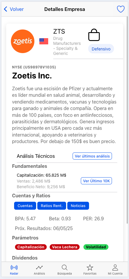 Acceso directo a los últimos análisis técnicos diarios que vamos publicando, al último 10K con posibilidad de traducirlo al español, cuentas, noticias actualizadas y una serie de información que te facilita tus análisis.