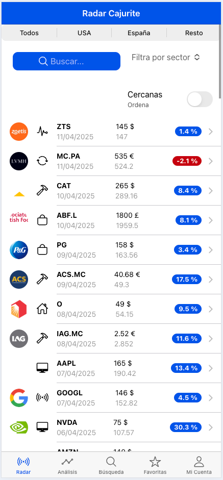Cada día dispondrás de la información más actualizada en precios de entrada objetivos por análisis técnico así como el porcentaje de distancia al precio actual. Además, si haces click dentro de cada empresa tienes un detalle de muchos parámetros de análisis para tus inversiones.