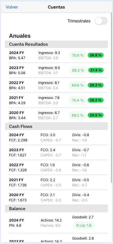 Entrando en el botón de Cuentas tienes disponibles los resultados (anuales y trimestrales) de las empresas. Todos bien ordenado y con colores para que veas que si algún parámetro necesita tu atención.
