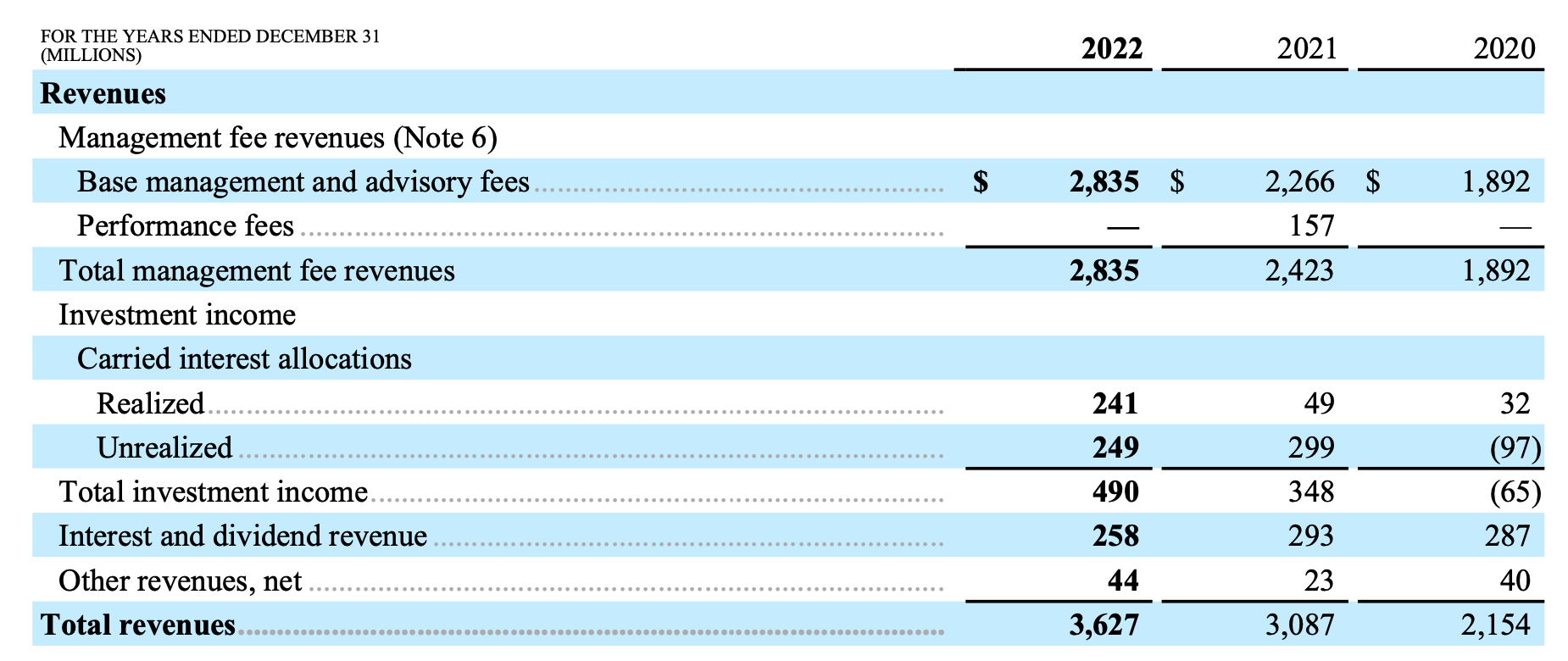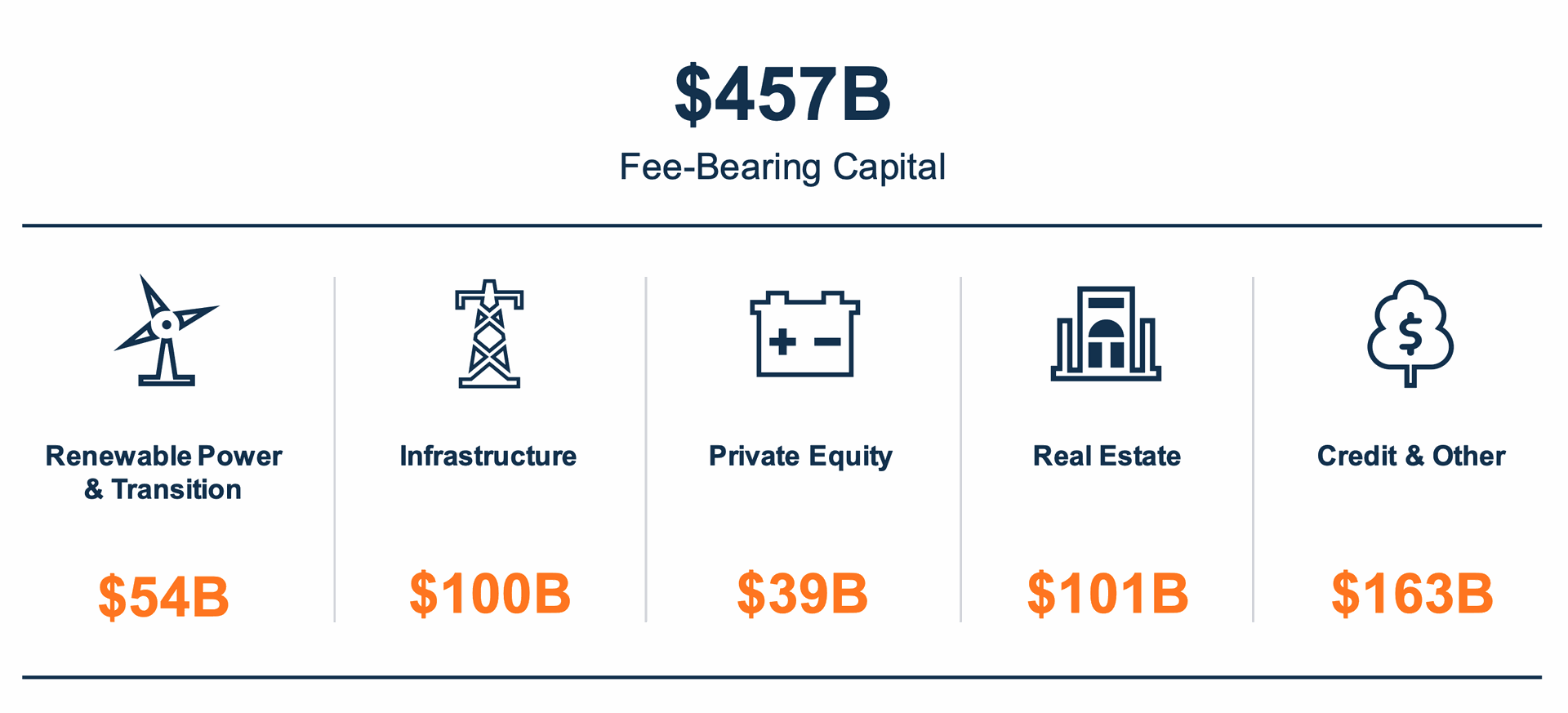 La empresa tiene fundamentalmente dos patas: la parte de Asset Management (AM) y la parte de Invested Capital. Gestionan 457 B$ de capital bajo gestión AUM con comisiones (Fee-bearing capital). Hay que comentar que no todos los AUM (activos bajo gestión) tienen comisiones.