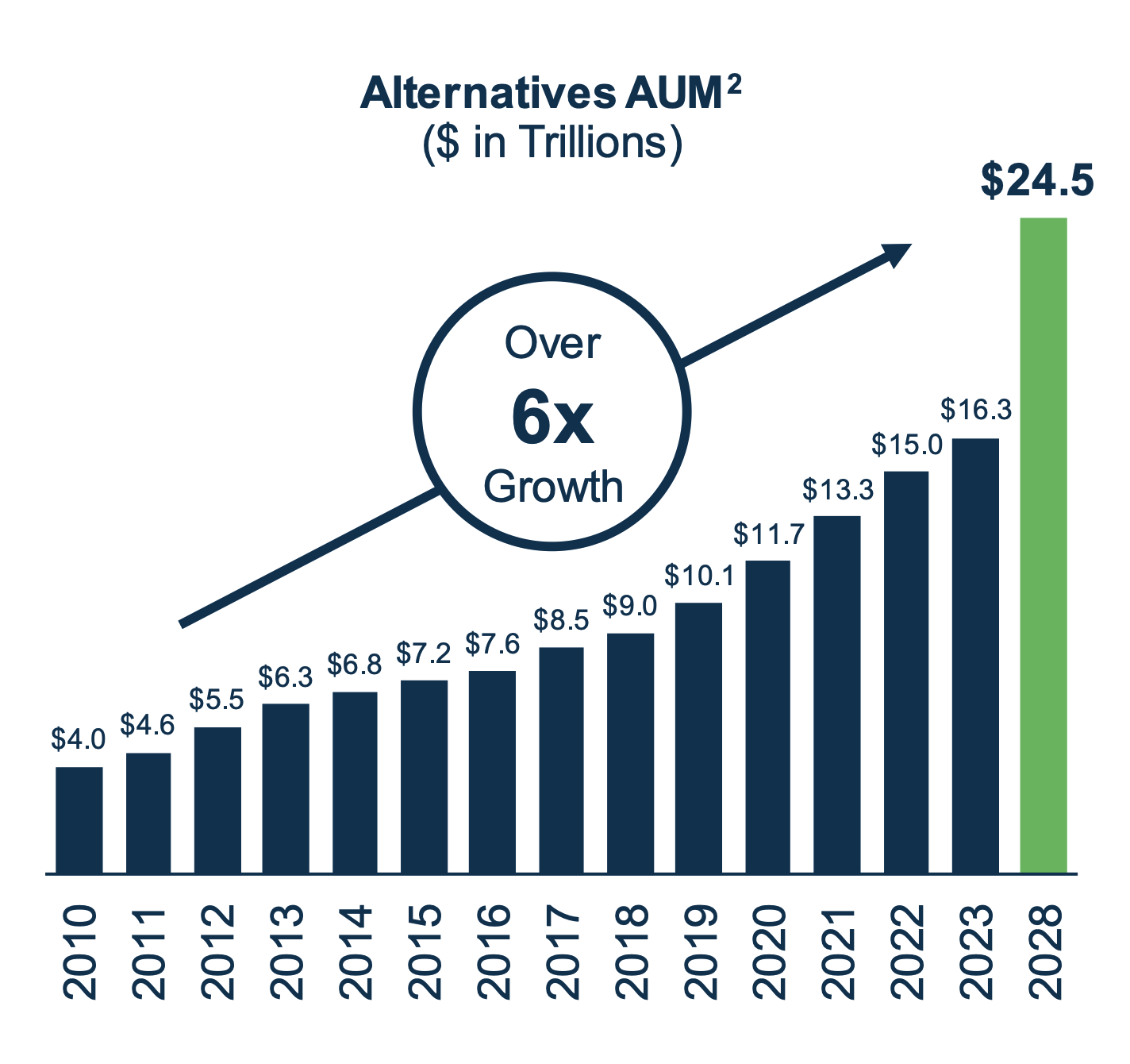Desde 2010 y hasta 2028, los activos bajo gestión (AUM) se esperan que pasen de 4 a 24 T$ (x6)