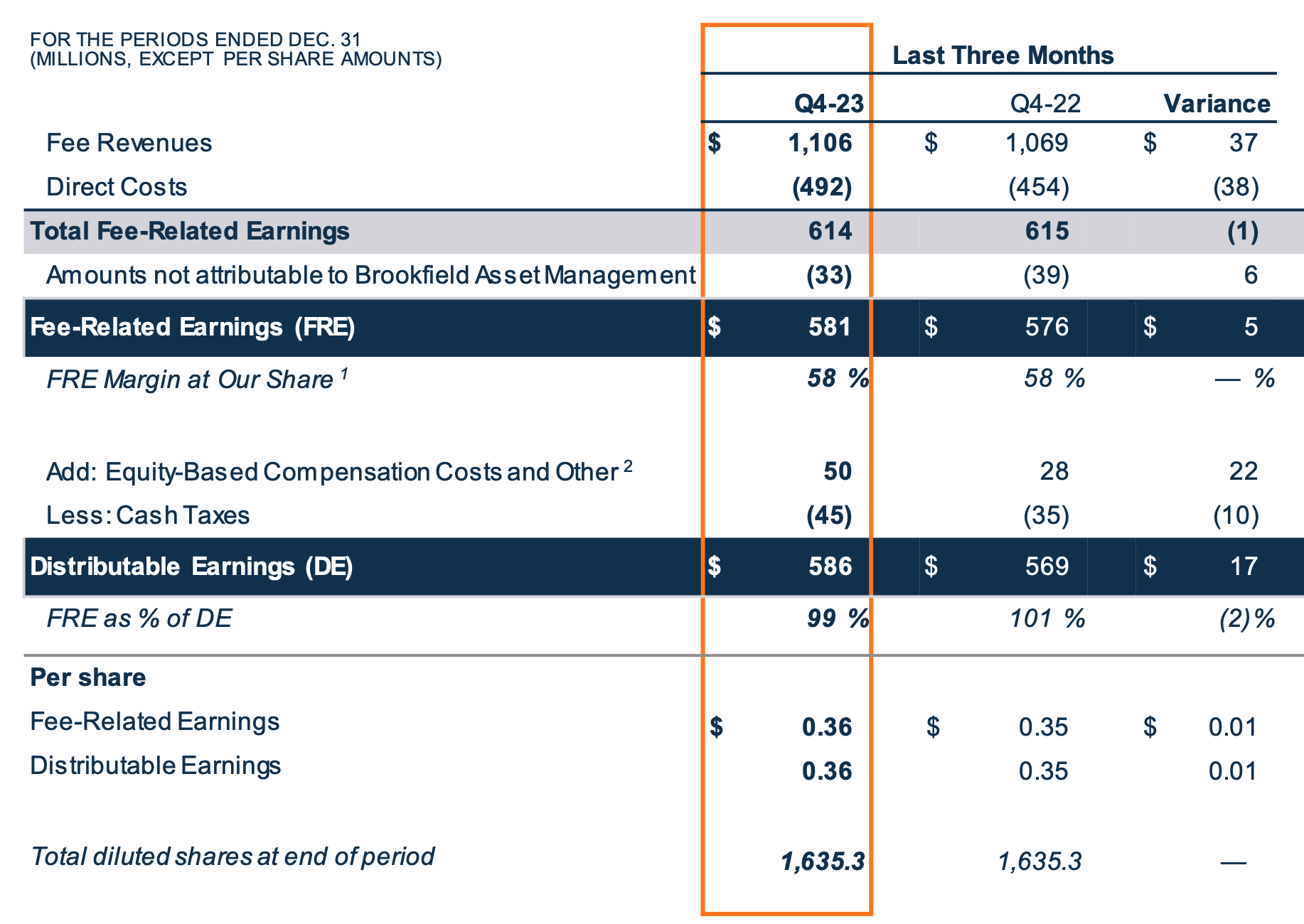 Vemos como cada año y trimestre las ventas, el BPA y los activos gestionados van aumentando. En este último Q4 del 2023 el margen ha sido del 55% (614/1106). Los beneficios a distribuir son de 586 M$ que teniendo en cuenta que tenemos 1.635 Macc. da un BPA de 0,36$/acción.