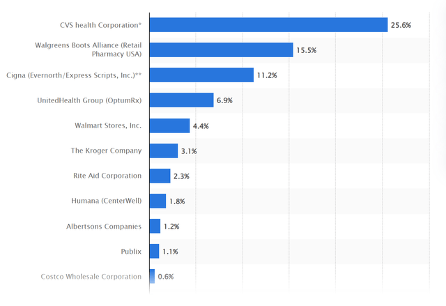 Competidores: Wallgreens es un rival duro en el sector farmacia (considerados ambos como duopolio) y recientemente apareció Amazon en el negocio online. CVS tiene un 25,6% del negocio de las recetas médicas.