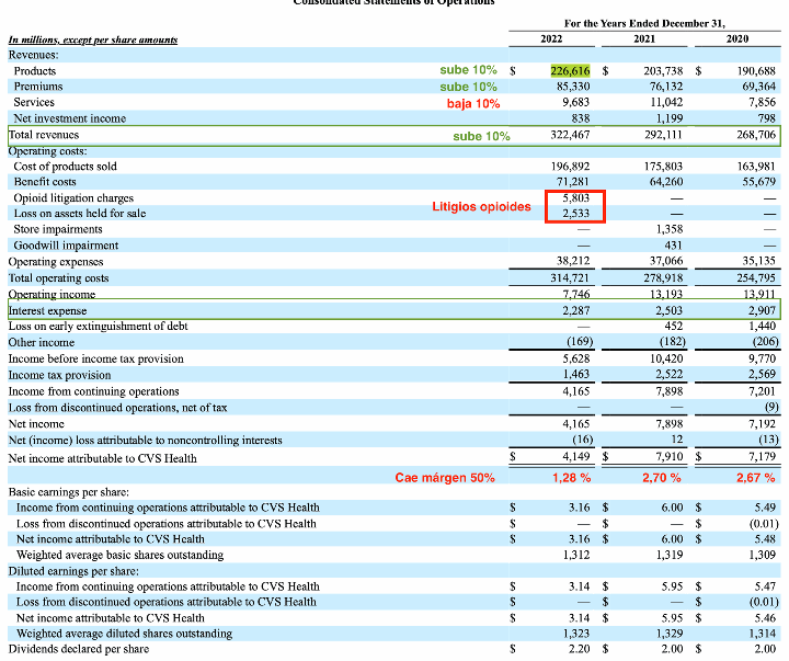 En 2022 han tenido unos ligitios con opioides que le han mermado el márgen y beneficio hasta casi el 50% menos. El BPA pasa de 6$ a 3,16$ y el margen cae hasta solo el 1,28%.