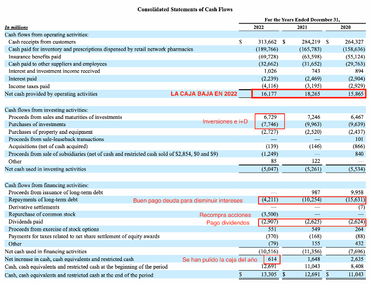 La empresa generó ingresos operativos de 3,7 B$. Recordemos que en el mismo Q de 2022 tuvieron pérdidas por el litigio de opioides de 5,2 B$ y una pérdida de 2,5 B$ por la depreciación del negocio de atención a largo plazo Omnicare.