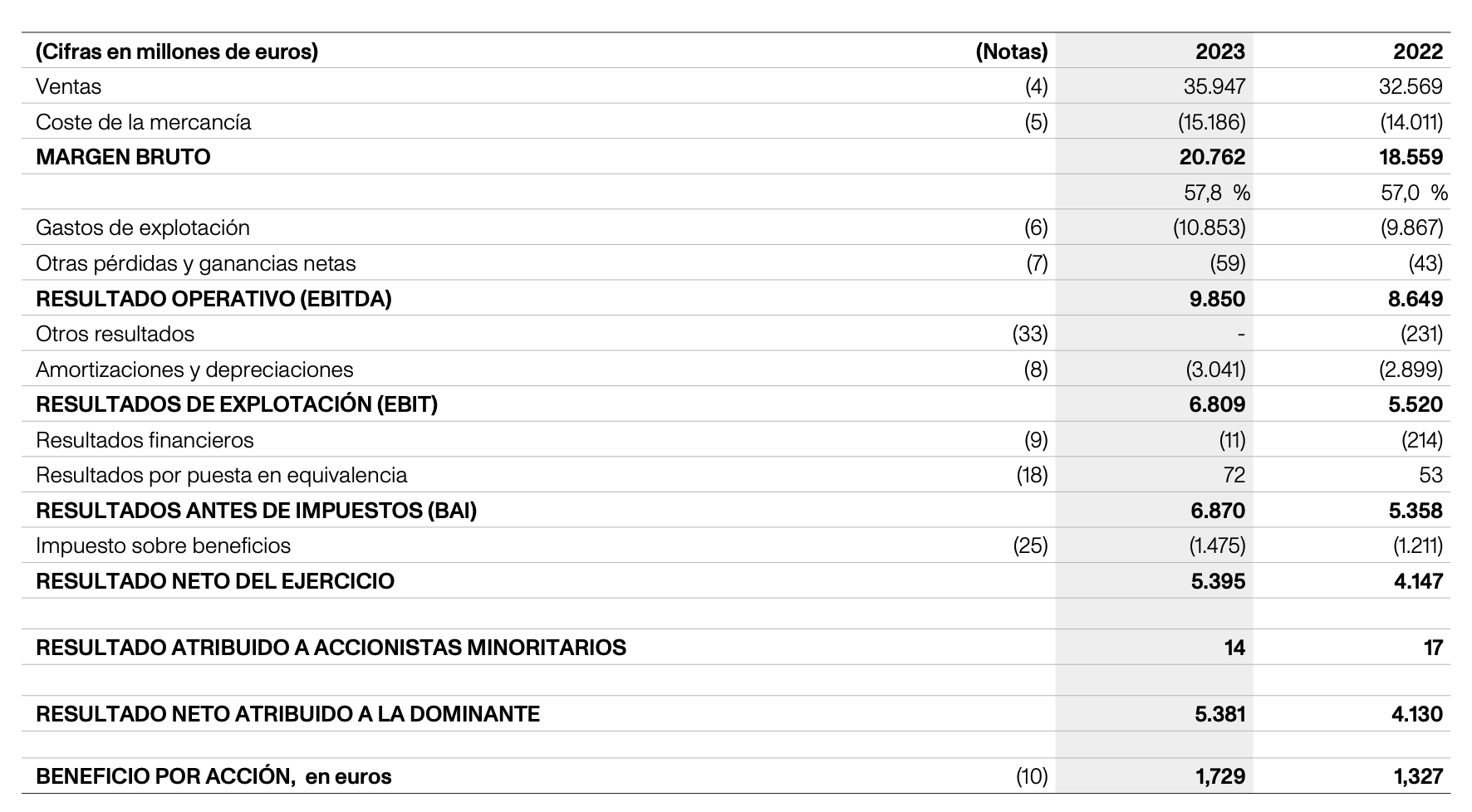 Continúan un año más los crecimientos de facturación y de beneficios hasta los 35.947 M€ y 6.809 M€ con un margen bruto del 58% y un neto del 19% (valores impresionantes). El BPA sube este 2023 hasta los 1,73€ vs 1,33€ del año 2022.
