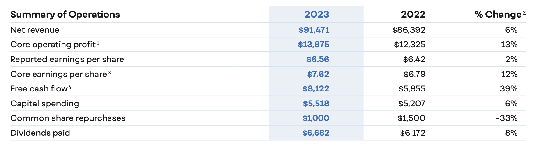 Con respecto a 2022 vemos una subida de ingresos ligeramente menor (6% vs 9%), sin embargo el beneficio operativo mejora considerablemente del 8 al 13%. Esto quiere decir que, Pepsi ha vendido menos, pero ha metido bien metida la inflación a sus productos. De hecho el BPA sube un impresionante 12% hasta los 7,62 $/acción.