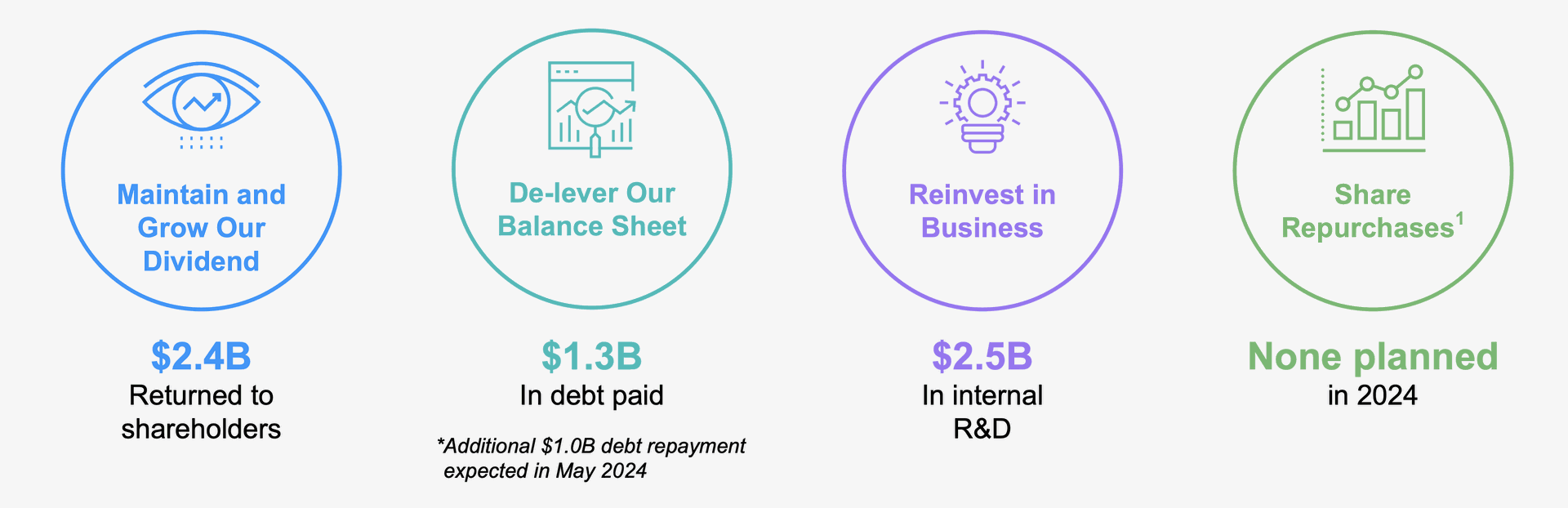 No hay previsiones en 2024 de recompra de acciones. Tienen pensado disminuir la deuda que es su gran problema, aunque quizás parezca poco esos 1,3 B$ de los 60 que tiene. La parte de los dividendos sigue siendo importante y piensan seguir aumentándolos.