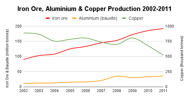- La producción de mineral de hierro creció un promedio del 8% (de 90 en 2002 a 200 MTm en 2011)