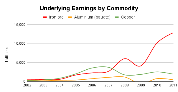 Aunque la producción de hierro hemos visto que subió un 8% anual, las ganancias pasaron de 458 M$ en 2002 a 12853 M$ en 2011 (+270% anualizado, una locura vamos ) Lo que aquí ocurre es que el precio del hierro aumentó unas 20 veces durante esa década. No tan abultado, pero algo parecido ocurrió con los otros metales.