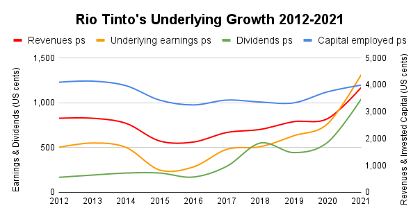 Como se puede ver en el gráfico anterior, el capital empleado de Río Tinto (capital + deuda) y los ingresos siguieron un camino muy similar a los precios del mineral de hierro durante la última década. Bajaron de 2013 a 2015 y luego se recuperaron lentamente hasta 2021. Pero la historia de las ganancias y los dividendos es muy diferente porque las ganancias y los dividendos crecieron extremadamente rápido en los últimos 10 años.