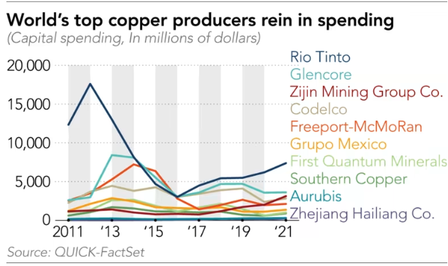 El Capex de los principales productores mundiales de cobre ha ido manteniendo los últimos años, salvo en el caso de Rio Tinto donde empieza a aumentar considerablemente. En Rio Tinto el proyecto de Simandou sigue siendo el principal gasto de capex, al menos hasta 2025 será así. También entran en escena proyectos de litio en los que aún se está a la espera del ok para comienzo.