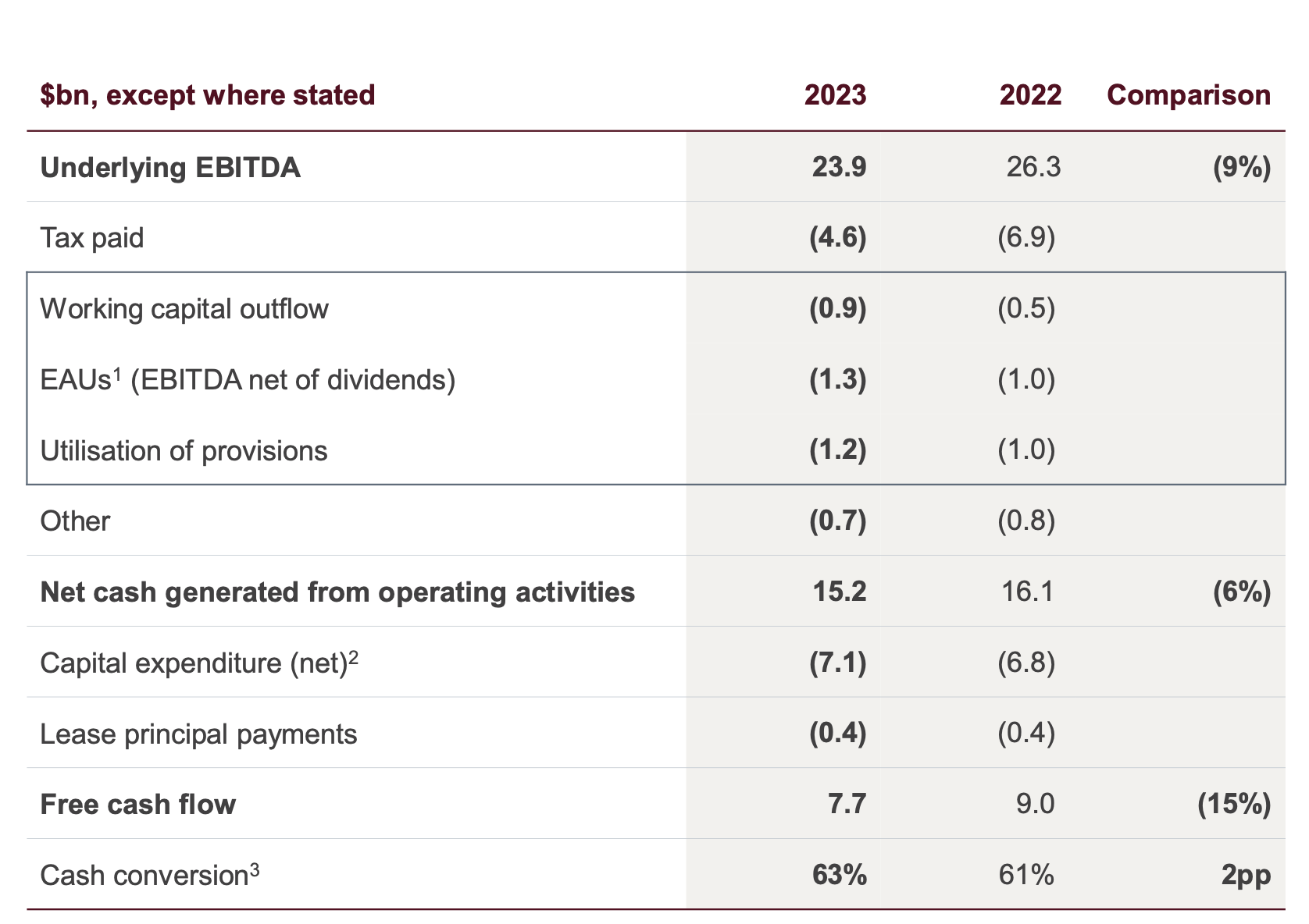 A pesar de ser un año de bajada con respecto a 2022 vemos una buena generación de cash flow hasta los 7,7$B. Por contra tenemos algunos impactos negativos del working capital.