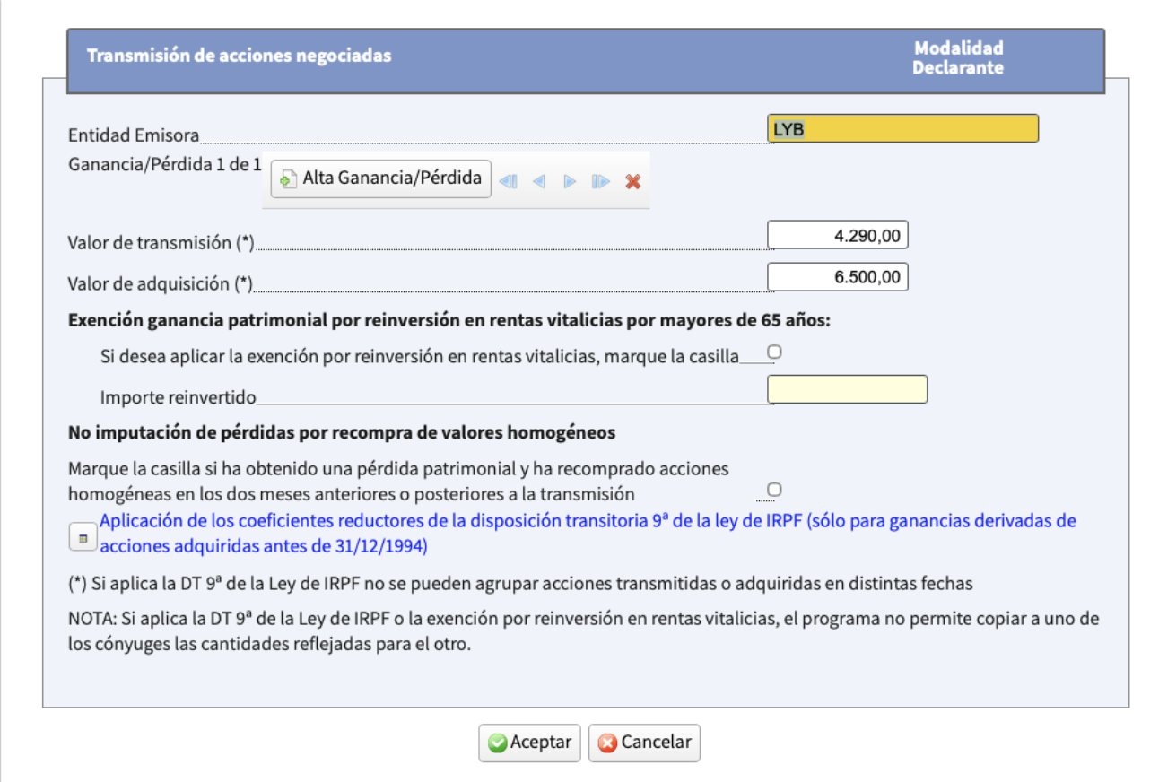 Hacienda considera esto un abuso, por lo que bloquea la deducción de la pérdida. Se lo tienes que decir a ellos en el apartado de ganancias y pérdidas patrimoniales al cargar una entidad. Aquí por ejemplo vemos que hay una pérdida (de más de 2000€) en LYB ya que el valor de transmisión es más bajo que el valor de adquisición.