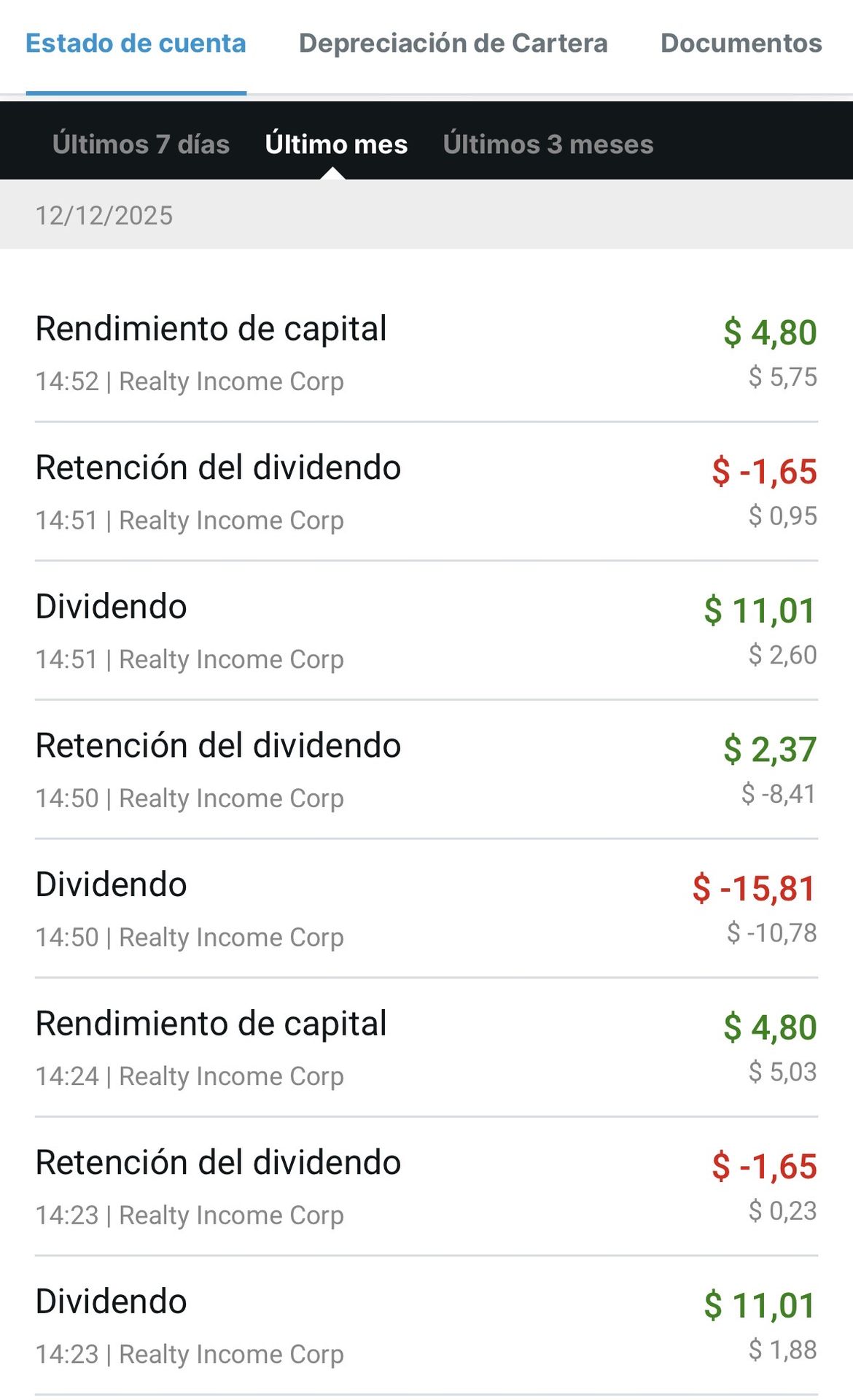- "Rendimiento de capital": Positivos ( +$4.80) → devolución de retención sobre la parte clasificada como return of capital.